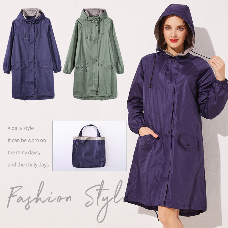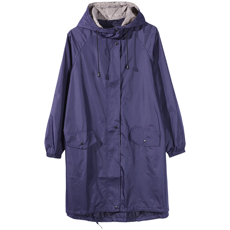 このレイン ジャケットは膝上まで覆うロング丈で、大きめの前ポケットが実用的です。