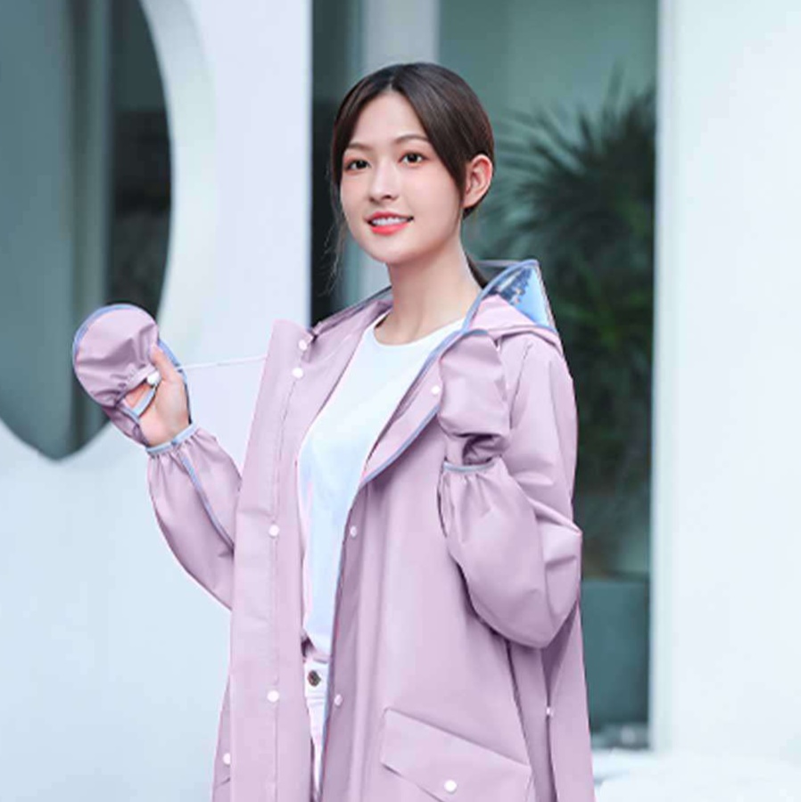 女性向けレインジャケットは、ドレスのような美しいシルエットで雨の日でも華やかさを演出します。すっきりとした襟元と長めの着丈が上品な印象を与え、透明なつば付きフードが視界を確保。袖口や裾のデザインにも配慮されており、機能性とスタイルを両立した一着です。雨の日のお出かけを楽しく、より自信を持って過ごせるレインウェアです。