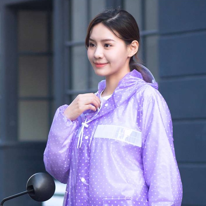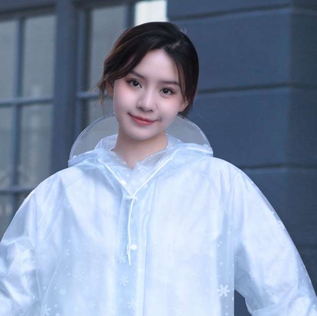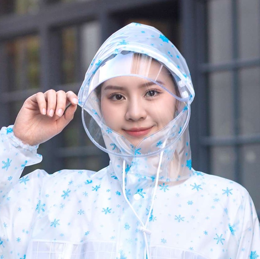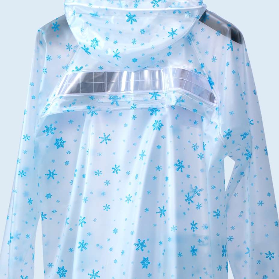 女性向けレインスーツ、雪の結晶模様が魅力的なデザイン。透明フードが視界を確保し、雨の日でも安心。前開きタイプで脱ぎ着がスムーズ。防水性と通気性を兼ね備えた機能性が高い一着。おしゃれでありながら、実用性も追求したレインウェアで、どんな天候でも快適に過ごせる。